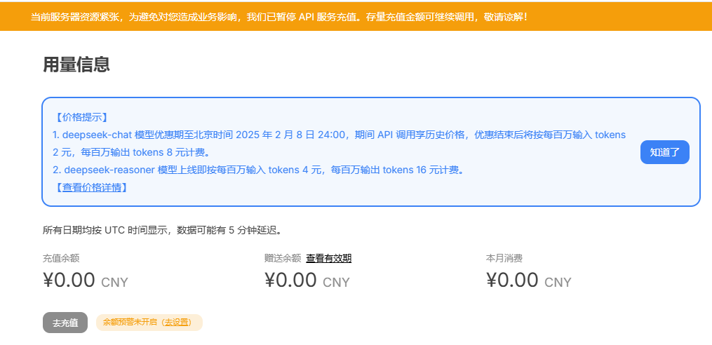 官方API需要在DeepSeek的官网(https://platform.deepseek.com/usage)中申请API服务,不过目前由于官方的服务器资源紧张,暂停了API的申请,需要等待后续通知。